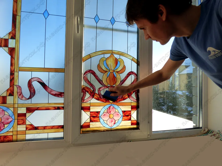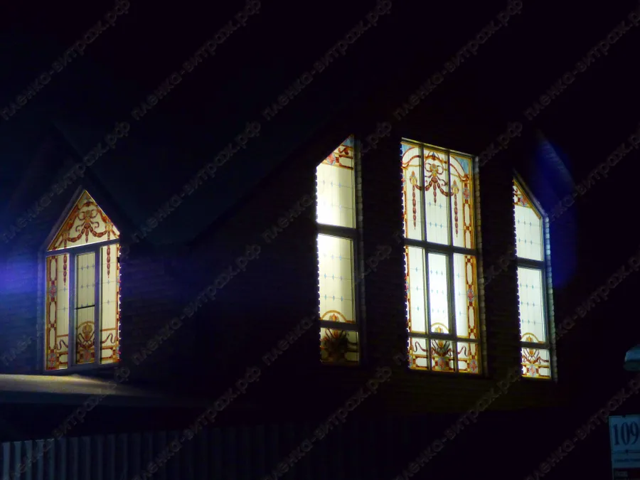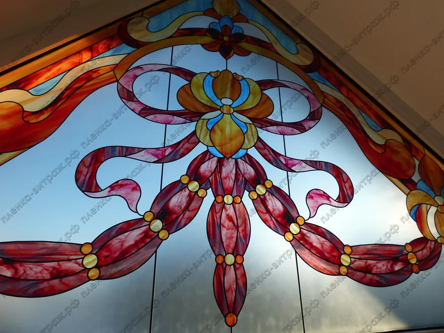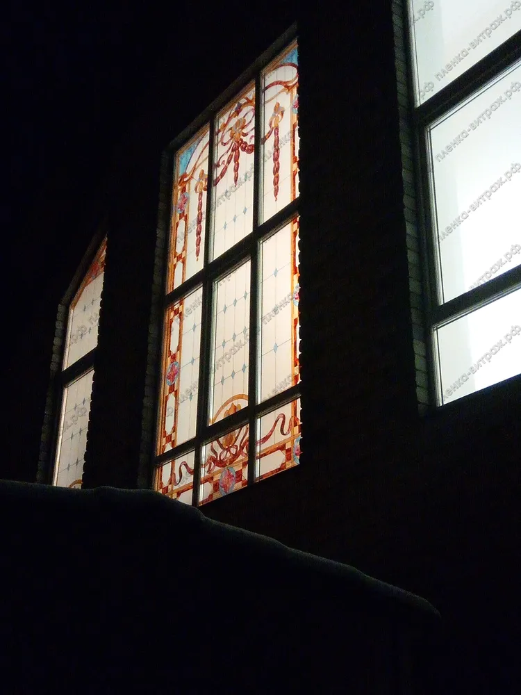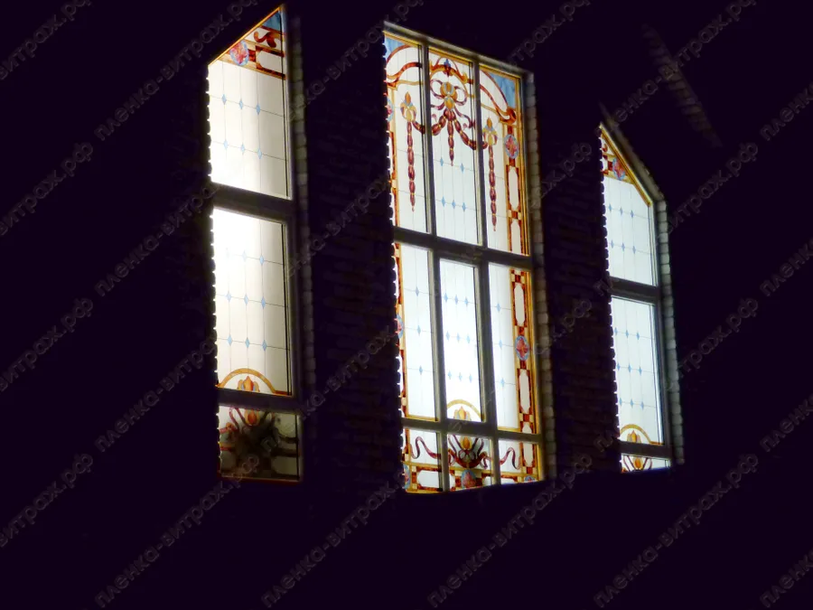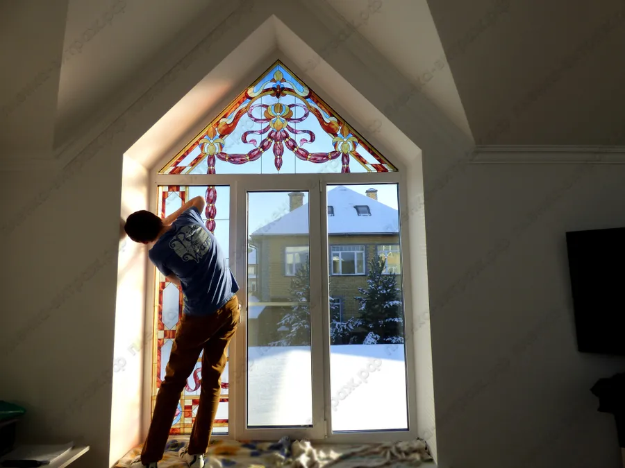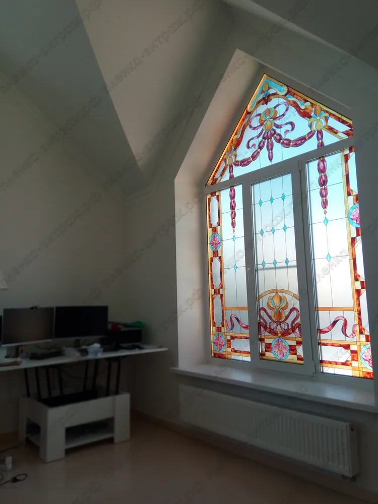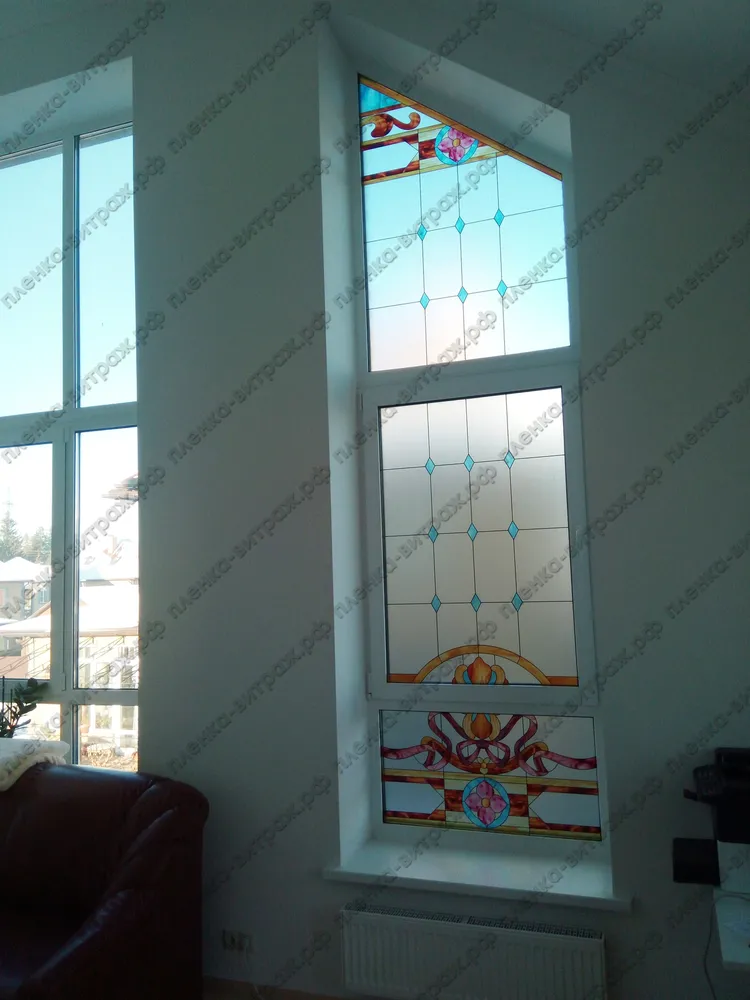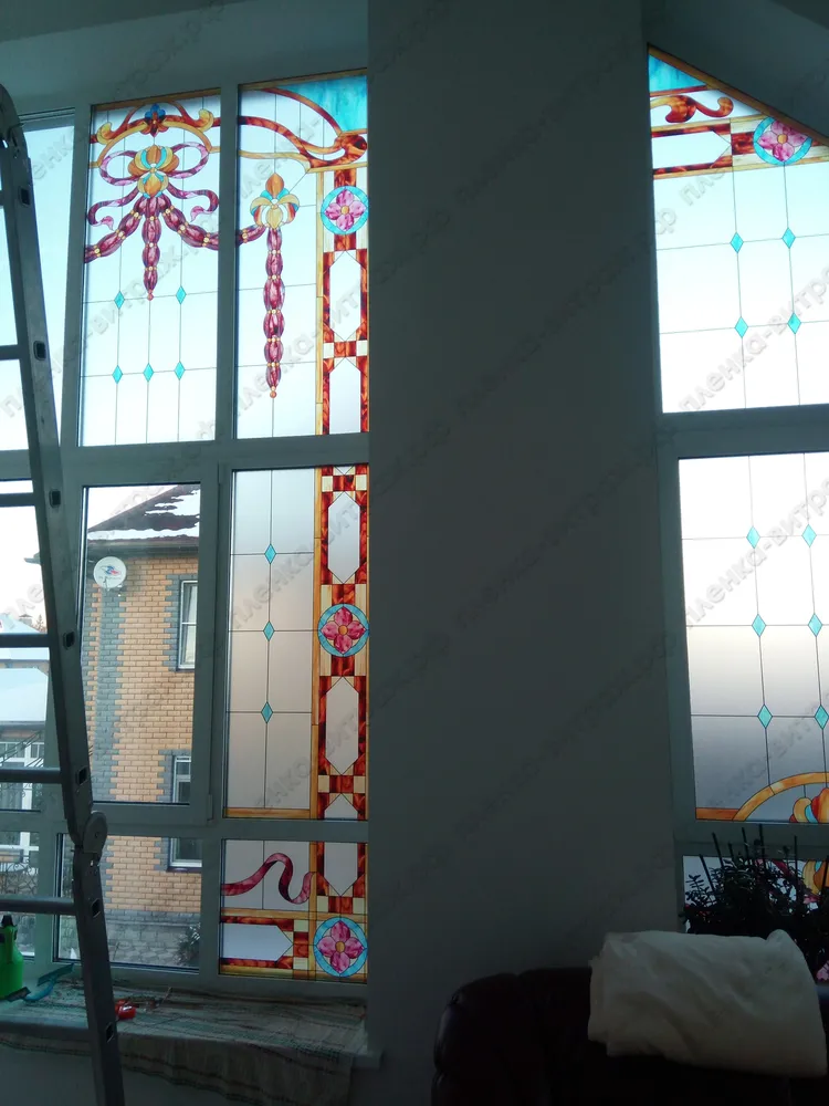 Индивидуальный проект. Витражи на пленке для больших нестандартных окон, выполнены в едином стиле.