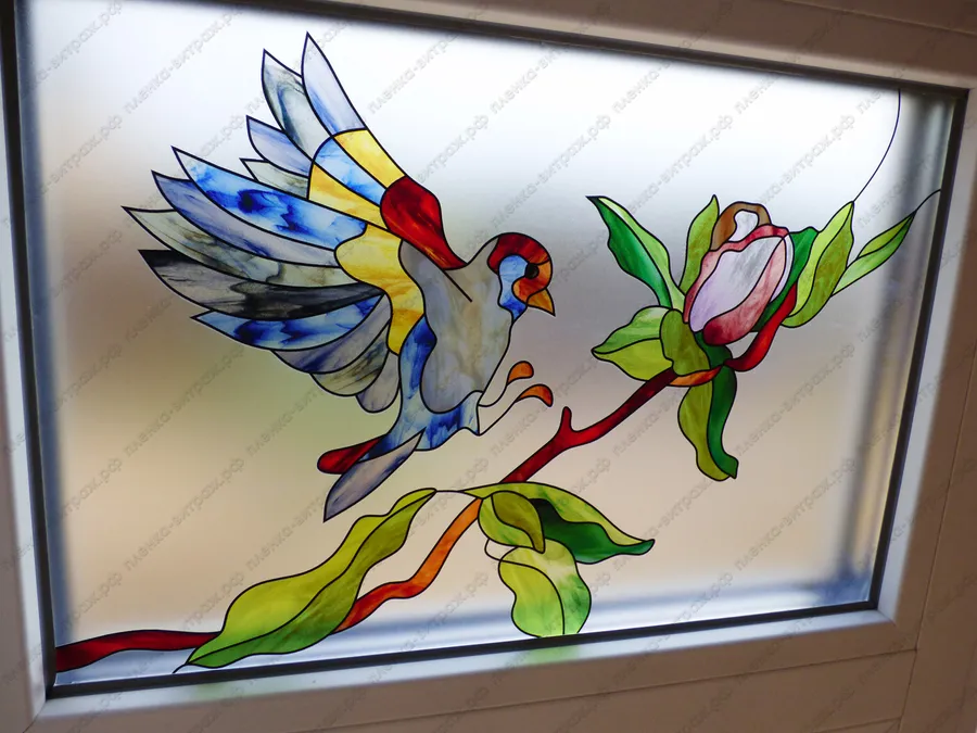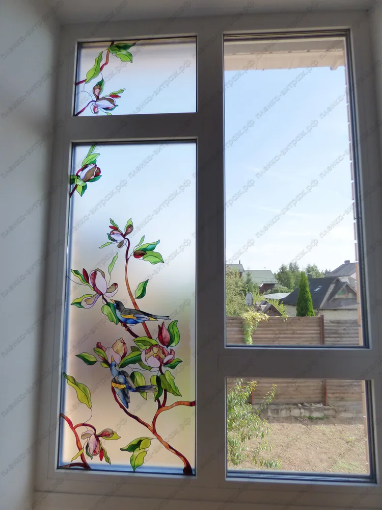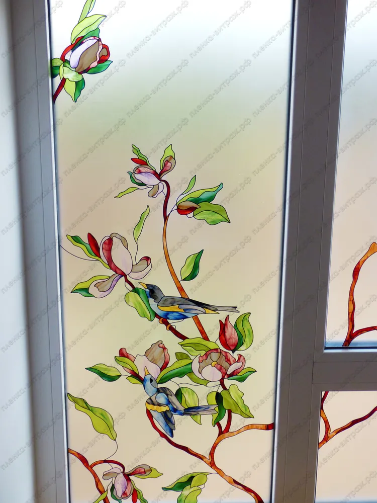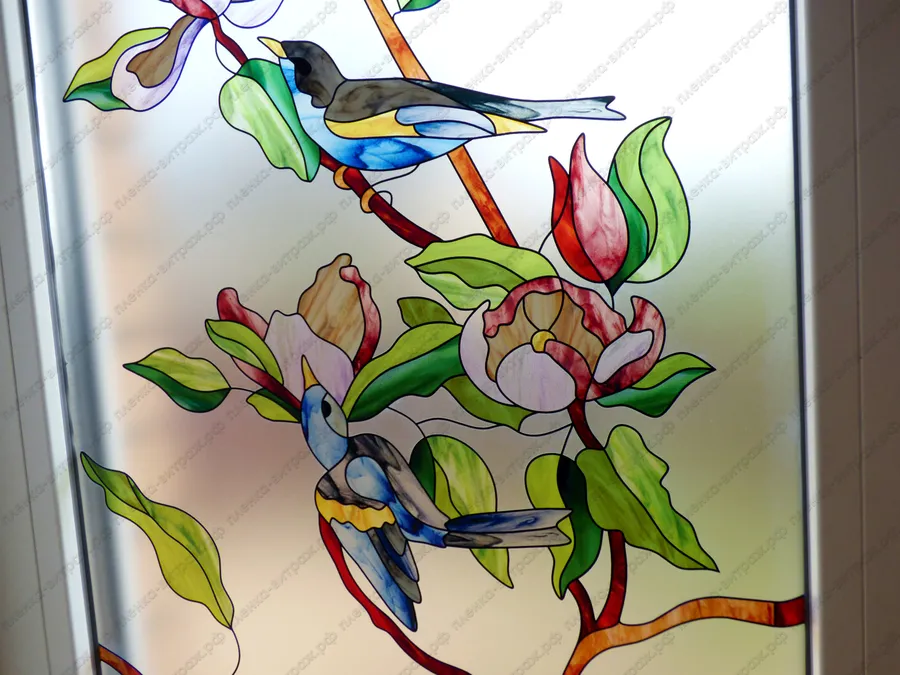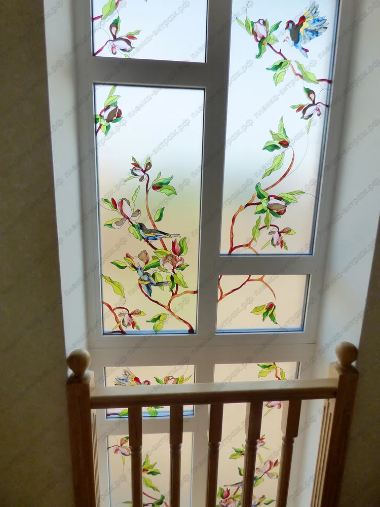 Витраж для окна на лестнице. Птицы на ветках с цветами.